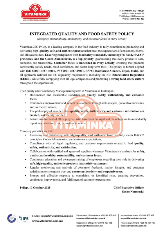 Integrated quality and food safety policy
